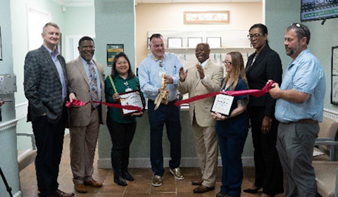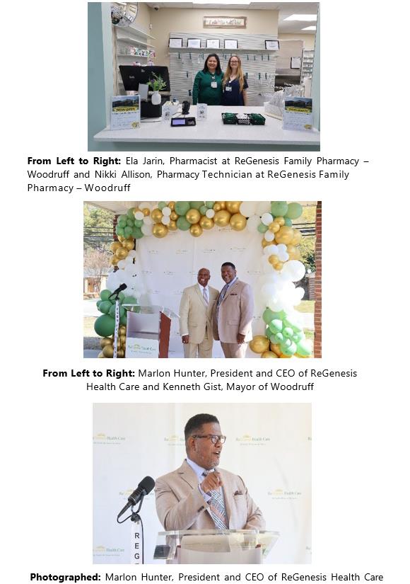 From Left to Right: John Kimbrell, Chief Business Affairs Officer at OneSpartanburg; Marlon Hunter, President and CEO of ReGenesis Health Care; Ela Jarin, Pharmacist at ReGenesis Family Pharmacy – Woodruff; Kelly Hunt, Chief of Pharmacy Operations at ReGenesis Health Care; Kenneth Gist, Mayor of Woodruff; Nikki Allison, Pharmacy Technician at ReGenesis Family Pharmacy – Woodruff; Valerie Sullivan, Board Chair at ReGenesis Health Care; and Lee Bailey, City Manager of Woodruff